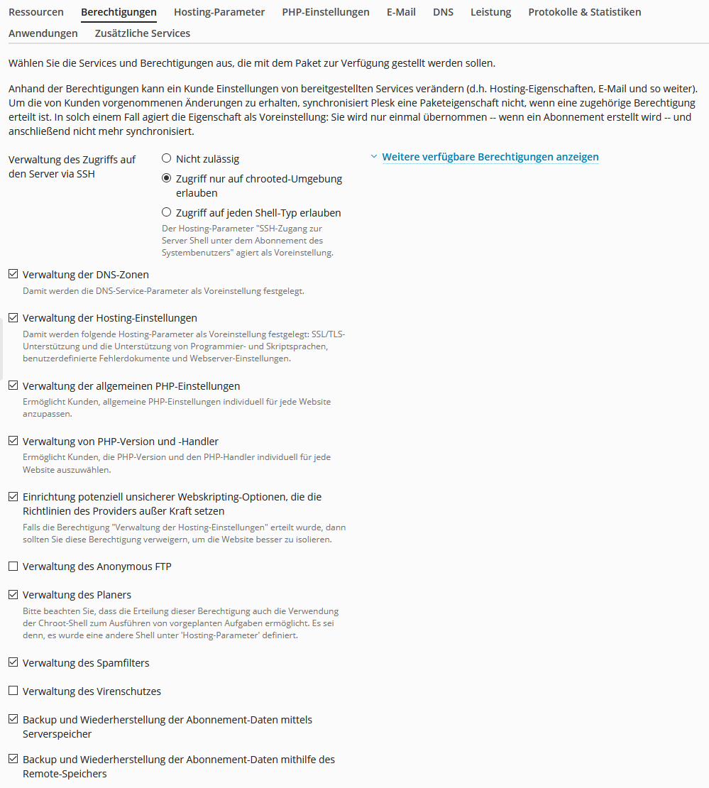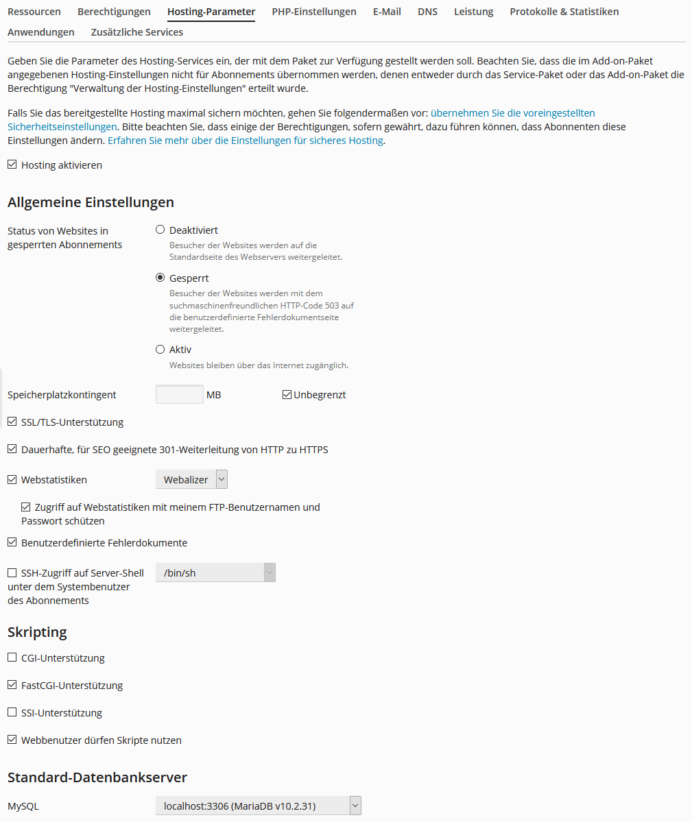 Hier legen Sie die jeweiligen Hostingeinstellungen wie Speicherplatz, Statistiken, Website-Status, Skriptunterstützung (PHP, FastCGI) sowie der SSH-Zugang für das jeweilige Hostingpaket fest. Bitte beachten Sie dass der Kunde bei gegebener Berechtigung (siehe oben) diese Einstellungen selbständig anpassen und verändern kann.