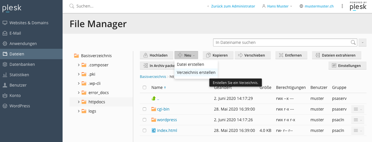 METANET bietet Datensicherungen bis zu 7 Tage rückwirkend an, empfiehlt jedoch, vor grösseren Änderungen eine eigene Sicherungskopie zu erstellen. Dies kann mit Plesk Backup oder durch Verzeichniskopien erfolgen, um gezielt nur Webdaten zu sichern. Der Prozess beinhaltet das Einloggen ins Plesk Administrationstool, das Erstellen eines neuen Verzeichnisses, das Kopieren der gewünschten Webdaten in dieses Verzeichnis und die Bestätigung des Vorgangs.