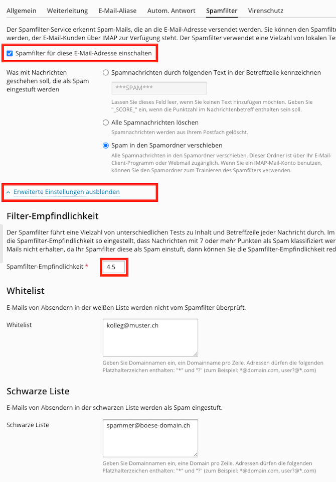 Sie können für jede einzelne E-Mail Adresse den SPAM-Filter wie folgt beschrieben verwalten und anpassen: