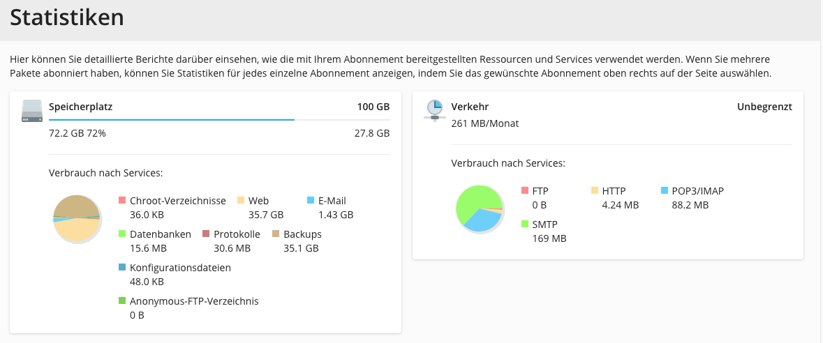 | Sie haben von uns eine E-Mail betreffend einer Speicherplatzüberschreitung erhalten und möchten wissen, wie sich die Speicherauslastung in Ihrem Abo verteilt. |