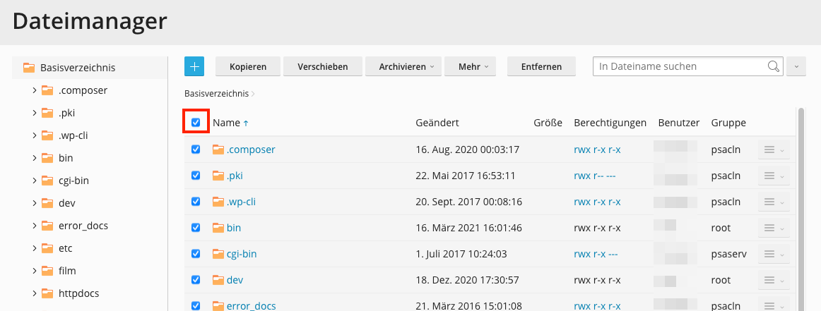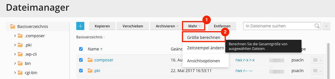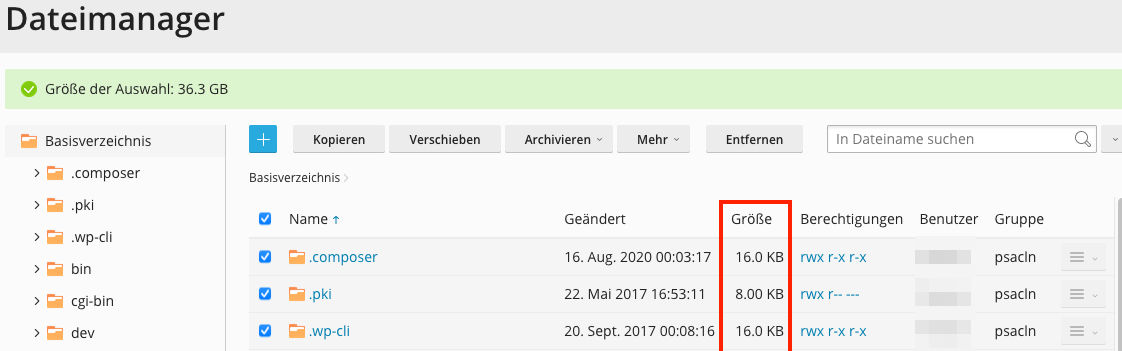 Plesk zeigt Ihnen nun einerseits die Gesamtgrösse aller ausgewählten Elemente sowie die grösse der Unterordner an.