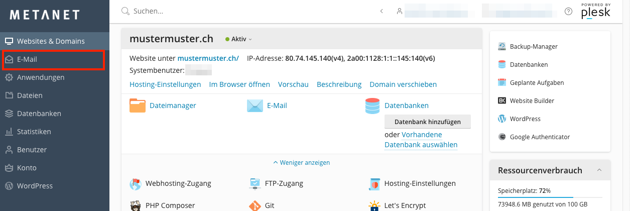 Um die Speicherauslastung durch Ihre Postfächer zu überprüfen, klicken Sie im Menü auf den Punkt E-Mail.