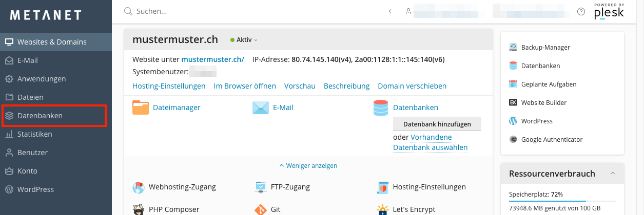 Um die Speicherauslastung durch die Datenbanken zu überprüfen, klicken Sie im Menü auf Datenbanken.