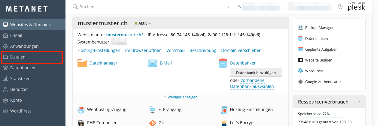 Um die Speicherauslastung Ihrer Webdaten zu überprüfen, klicken Sie im Menü auf den Punkt Dateien.
