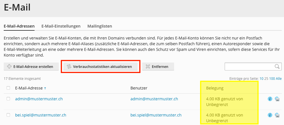 Sie sehen nun in der Spalte Belegung den Speicherverbrauch der einzelnen Konten. Über den Button Verbrauchsstatistiken aktualisieren können Sie die Statistik aktualiseren.