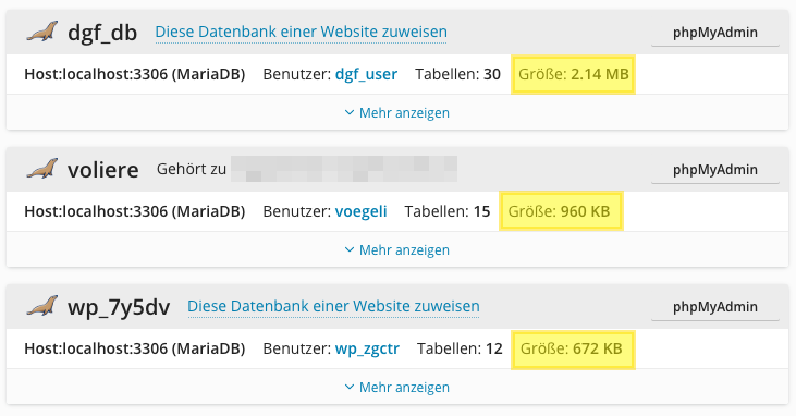 Nun sehen Sie eine Übersicht all Ihrer Datenbanken inkl. der Grösse der betreffenden Datenbank.
