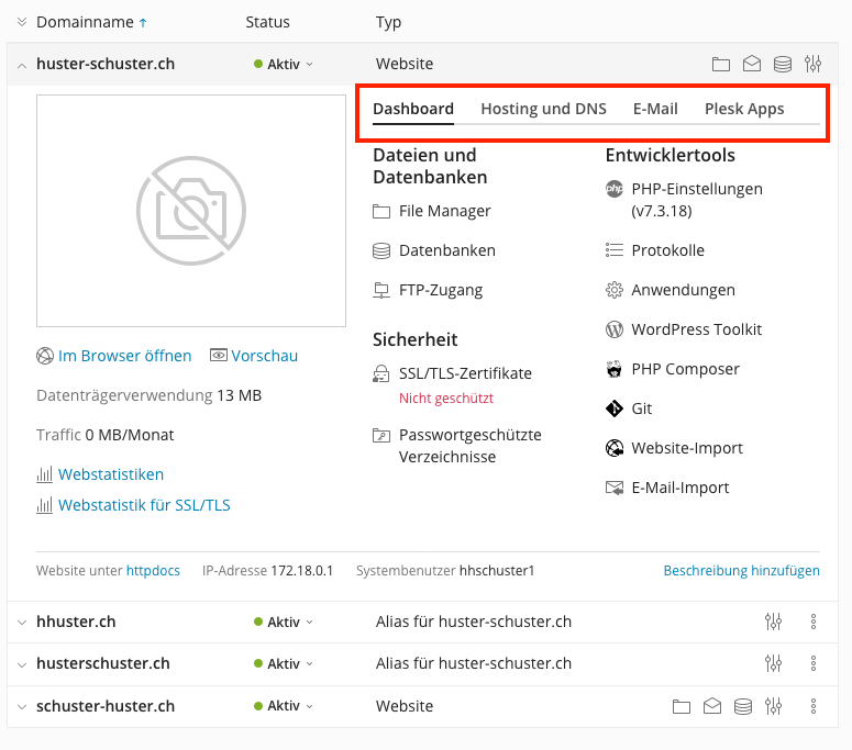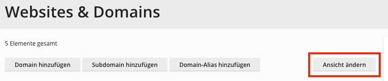 Plesk 18 bietet bei Websites & Domains eine neue, übersichtliche Ansicht, die Dynamische Liste. Hier sind gleich alle Domains des Abonnements auf einmal ersichtlich.