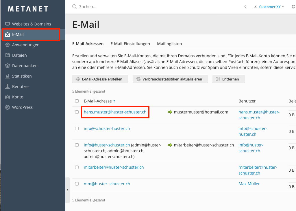 2. Navigieren Sie zum Reiter E-Mail und klicken Sie auf die entsprechende E-Mail Adresse, für welche die Liste angepasst werden soll.
