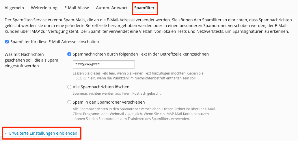 3. Wechseln Sie zum Reiter Spamfilter und klicken Sie auf den Link Erweiterte Einstellungen einblenden: