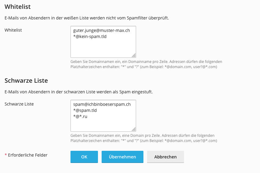 4. Tragen Sie E-Mail Adressen, die nicht durch den Spamfilter geprüft werden sollen, in die Whitelist ein (nur eine E-Mail Adresse pro Zeile). E-Mail Adressen, die unerwünscht sind, tragen Sie in die Schwarze Liste ein. Speichern Sie die Einstellungen anschließend mit OK.