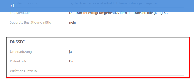 Bei einzelnen Domain-Endungen können bestehende DNSSEC-Daten nicht sauber übernommen werden und DNSSEC wird mit dem erfolgreichen Transfer zu METANET deaktiviert. Ob die gewünschte Domain-Endung davon betroffen ist, wird auch in der Domain Info-Box ausgegeben. In diesen Fällen können Sie die DNSSEC-Daten jederzeit nach Abschluss des Transfers bei uns wieder nachtragen.