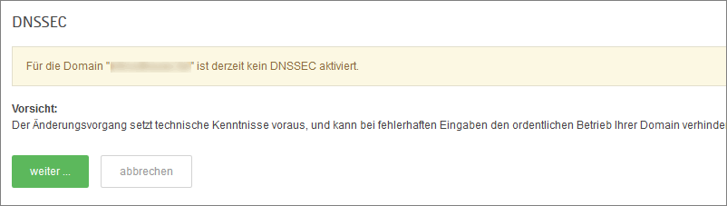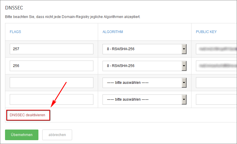 Sollten Sie DNSSEC nicht mehr benötigen, können Sie dies mit der Funktion "DNSSEC deaktivieren" jederzeit abschalten: