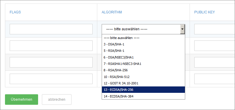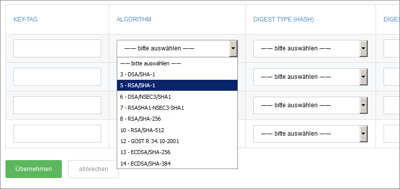 Nun können die Ressourcen-Einträge hinterlegt werden. Je nach gewählter Domain-Endung werden DS bzw. DNSKEY-Einträge erwartet: