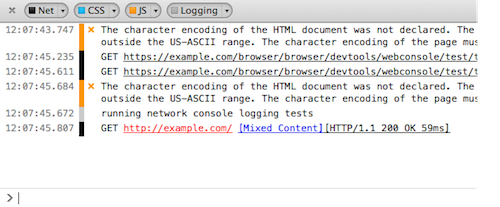 Wird die Webkonsole von Firefox gestartet, so erscheint auf der Webkonsole ein Mixed Content-Warnhinweis. Die über HTML geladene Mixed Content-Ressource wird in Rot angezeigt, zusammen mit dem Text "mixed content" , der ein Link zu dieser Seite ist.