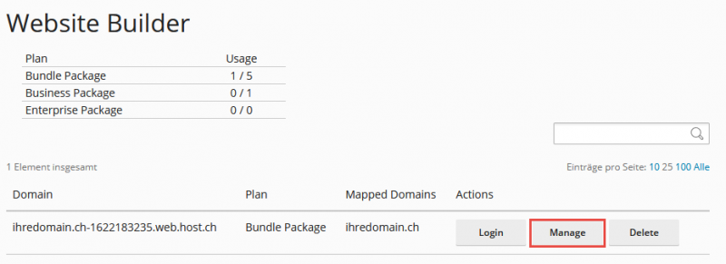 Falls Sie eine Dritt-Domain bzw. eine nicht über dieses Abo verwaltete Domain zuweisen möchten, kann dies ebenfalls über den Editor unter Verwalten → Domain Verknüpfung vorgenommen werden. Bitte beachten Sie hierzu unsere Anleitung Website Builder: Weitere Domains verknüpfen