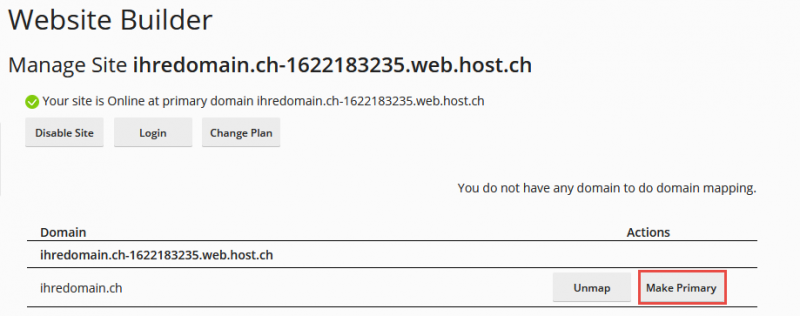 Setzen Sie Ihre Domain als Primär-Domain: Wählen Sie "Manage" und definieren Ihre Domain als "Primary":