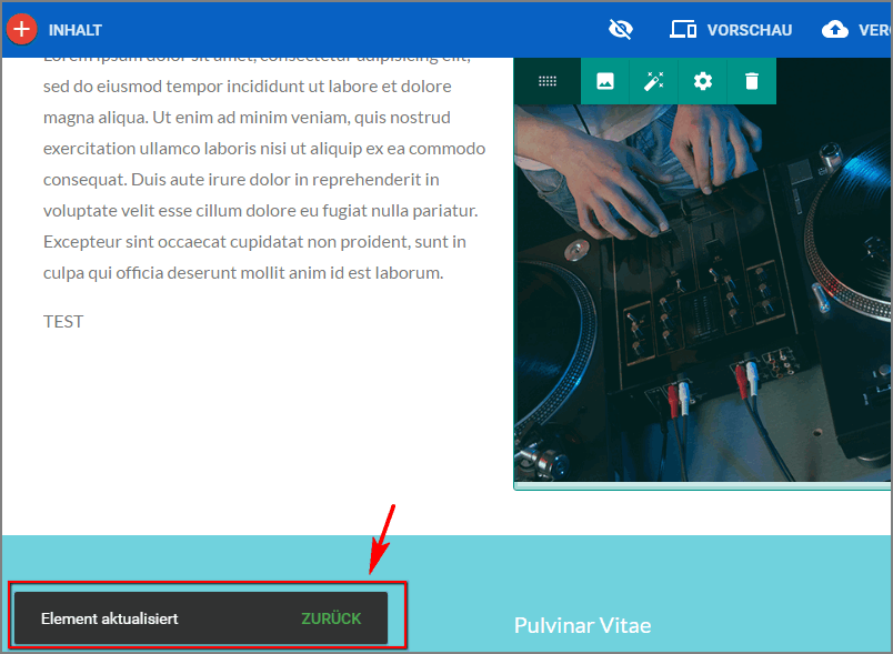 Die Umgebung kann nicht durch den Benutzer selbst separat gesichert werden. Fehler bei der Bearbeitung müssen somit umgehend innerhalb der Sitzung rückgängig gemacht werden. Sobald eine Aktion rückgängig gemacht werden kann, wird am unteren Rand des Editors eine Meldung angezeigt. Mit "Zurück" wird die Änderung rückgängig gemacht