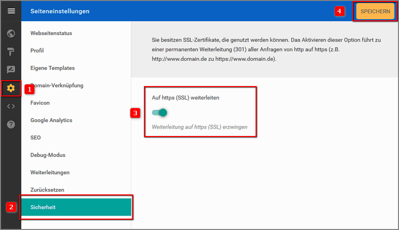Standardmässig werden jedoch nur Anfragen verschlüsselt, welche explizit mit https:// aufgerufen werden. Um jegliche Anfragen generell zu verschlüsseln, können Sie eine permanente Umleitung von HTTP auf HTTPS aktivieren. Im Website Builder-Editor können Sie dies unter "Seiteneinstellungen" -> "Sicherheit" konfigurieren: