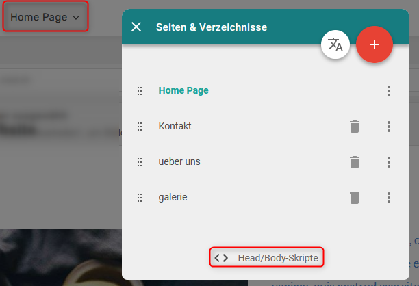 <!-- Google tag (gtag.js) --><script async src="https://www.googletagmanager.com/gtag/js?id=UA-123456-7"></script><script> window.dataLayer = window.dataLayer || []; function gtag(){dataLayer.push(arguments);} gtag('js', new Date()); gtag('config', 'UA-123456-7');</script>Klicken Sie auf Home Page und anschliessend auf <> Head/Body-Skripte.