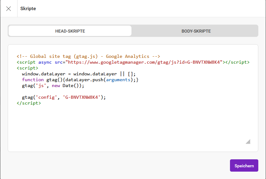Fügen Sie den gtag.js Code hinzu und klicken Sie auf Speichern.