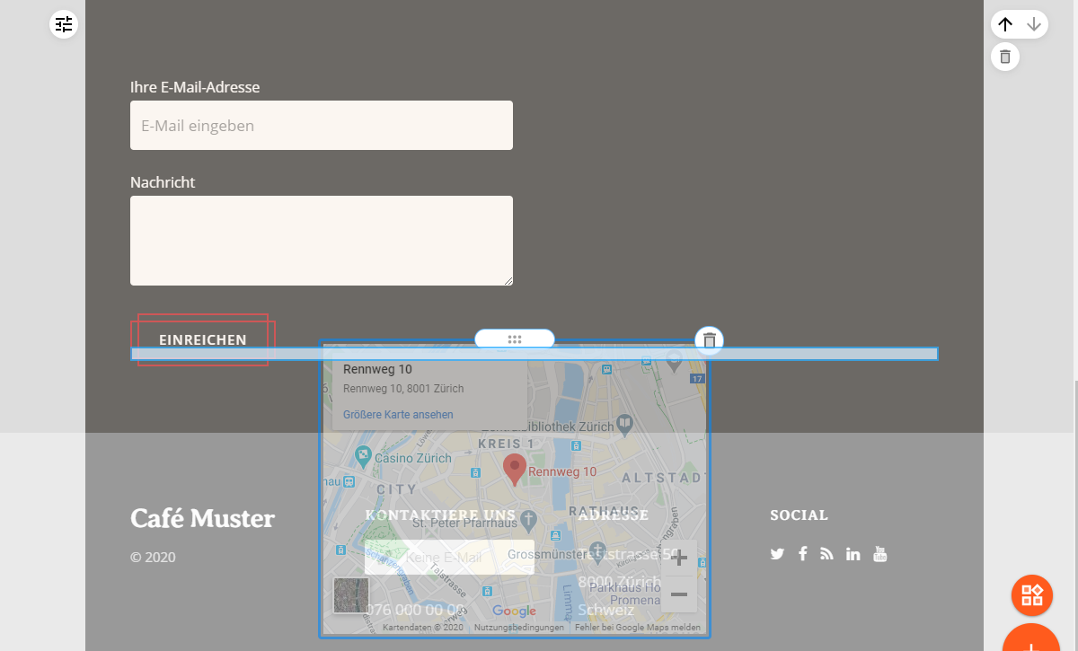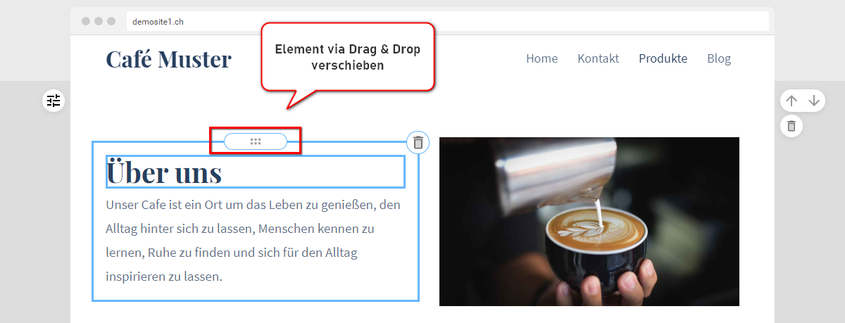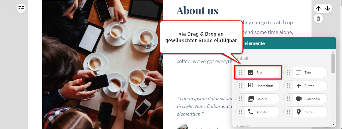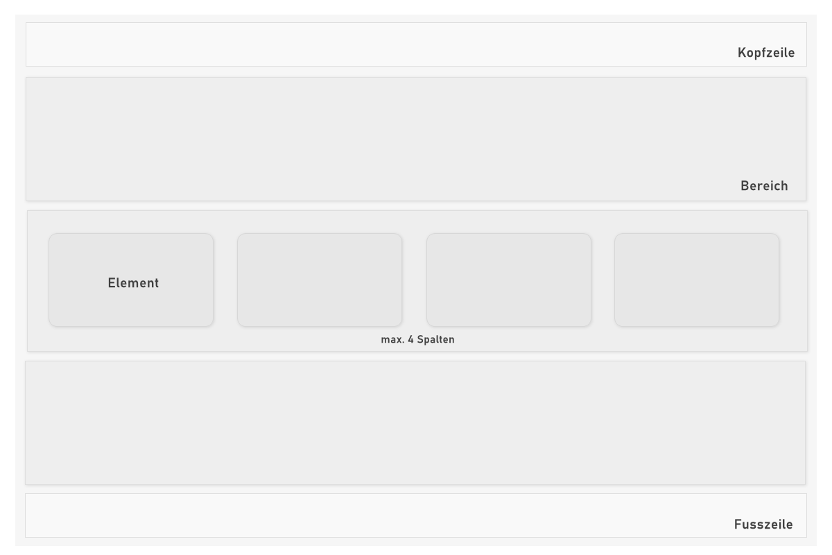 Mit Drag & Drop können die Elemente jeweils links, rechts, unterhalb oder oberhalb eines bestehenden Elements platziert werden. Innerhalb eines Bereichs können bis zu maximal 4 Spalten mit Elementen erstellt werden.