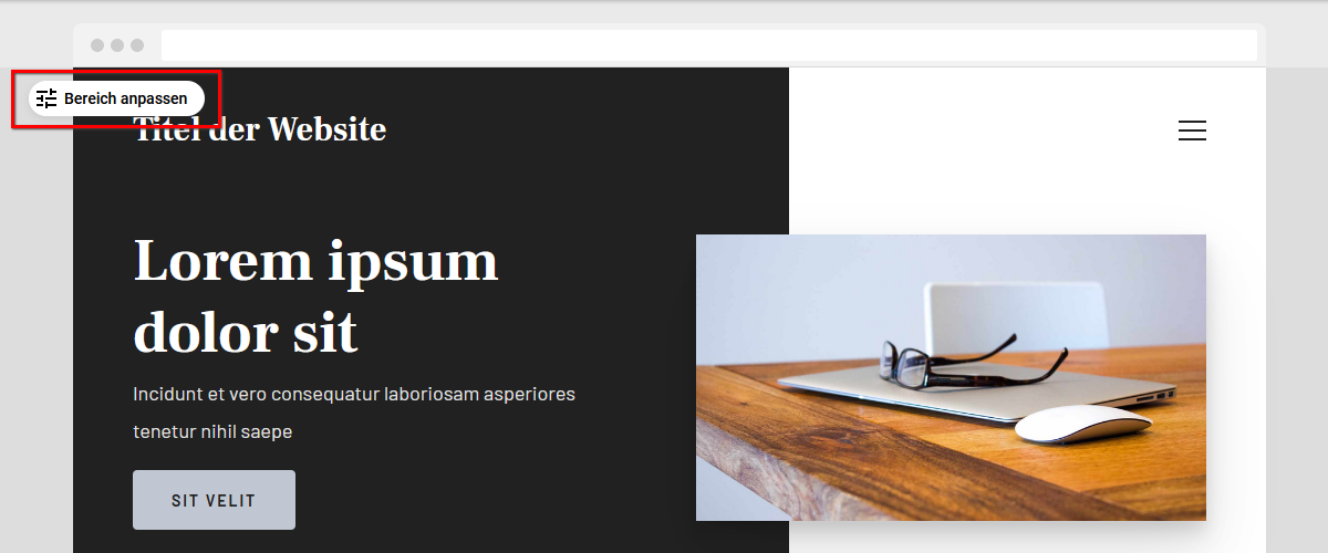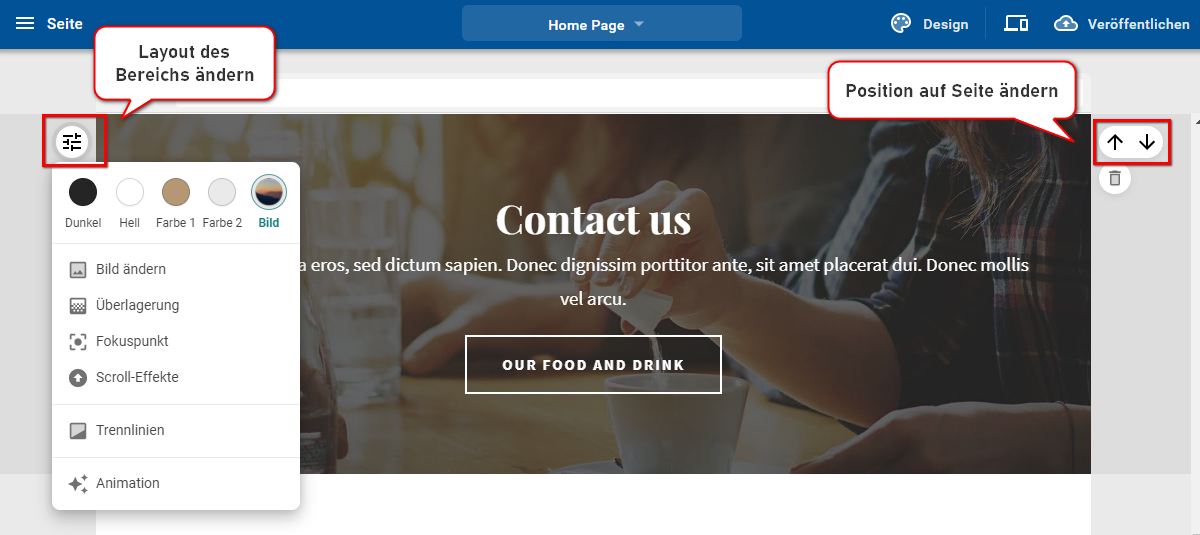 Die Kopf- und Fusszeile (oberster und unterster Bereich der Seite) prägen stark das Erscheinungsbild Ihrer Web-Präsenz (analog zu den Templates/Vorlagen in früheren Versionen). Das gewünschte Design (z.B. Menü-Führung) können Sie über die Funktion “Bereich anpassen” und “Layout ändern” auswählen.