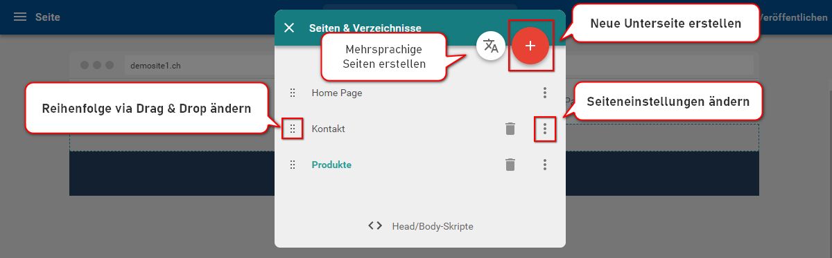 In diesem Menü können Unterseiten und Verzeichnisse (Navigationspunkt mit mehreren Unterseiten) erstellt und verwaltet werden. Das Menü dient ebenfalls dem schnellen Wechsel zwischen den Seiten, um den Inhalt darin zu bearbeiten.