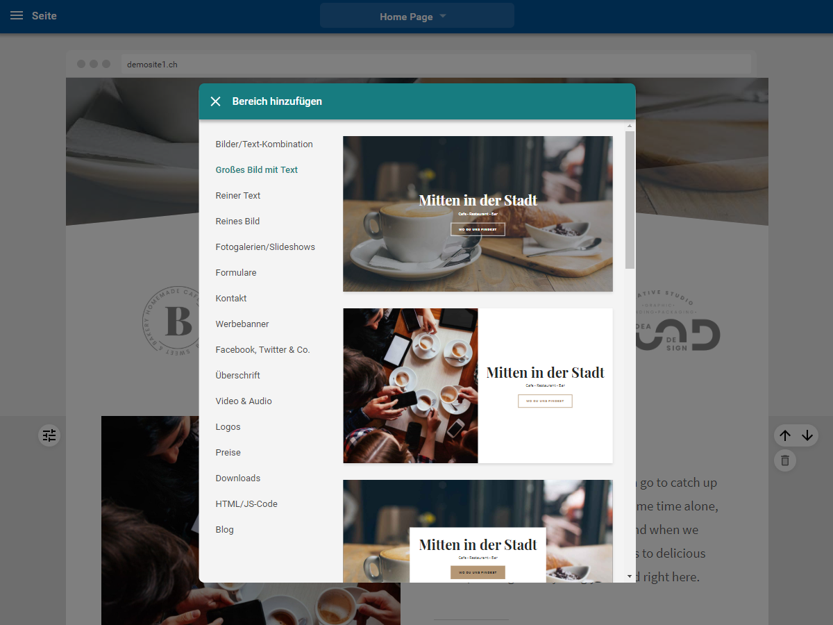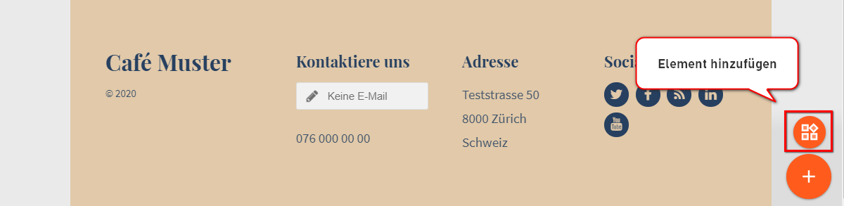 Mit der Funktion "Elemente" können bestehende Bereiche mit weiteren Inhalten erweitert werden. Bestehende Elemente können mit einem Klick auf den jeweiligen Bereich bearbeitet werden.