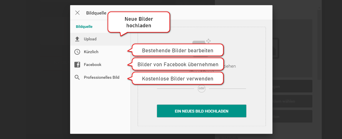 Bilder können für Galerien, Hintergründe oder Einzelbilder eingefügt und bearbeitet werden.