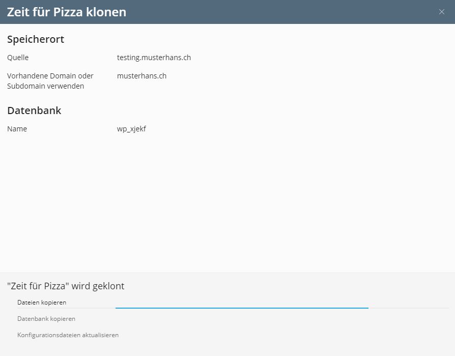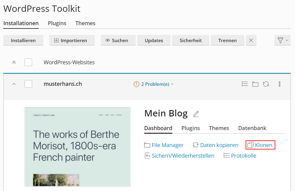 Mit dem WordPress Toolkit ist es möglich, bestehende Instanzen zu klonen sowie zu synchronisieren. Da WordPress absolute Pfade einsetzt, hat diese Methode den grossen Vorteil, dass die Pfade nicht manuell angepasst werden müssen.