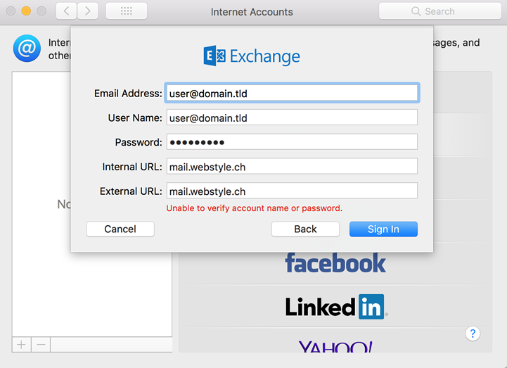 Für die interne als auch externe URL hinterlegen Sie den Mailserver "mail.webstyle.ch" und bestätigen anschliessend die Angaben mit Sign In. Somit ist das E-Mailkonto eingebunden.