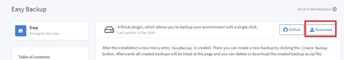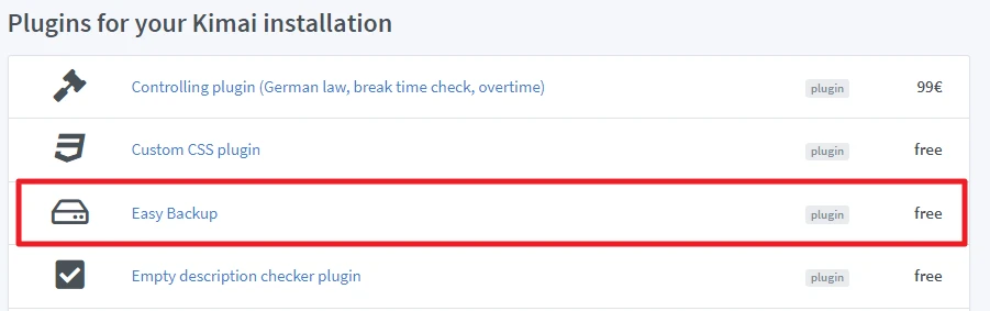 Ich zeige euch hier an einem Beispiel, wie ihr diese Erweiterungen in Kimai integrieren könnt. Auf der Webseite suche ich mir also beispielhaft das „Easy Backup“ Programm aus.